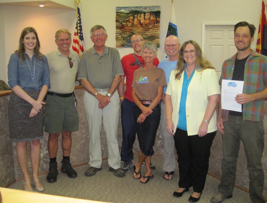 Members of Cottonwood Community Development and the Verde Valley Cyclists Coalition are presented with the Cottonwood City Council’s 2012 proclamation of May as Bike Month. L-R: Nikki Arbeiter (Community Development), Randy Victory, Devin Dix, Deb Smith, Jim Smith, Mayor Diane Joens & City Councilman Tim Elinski
