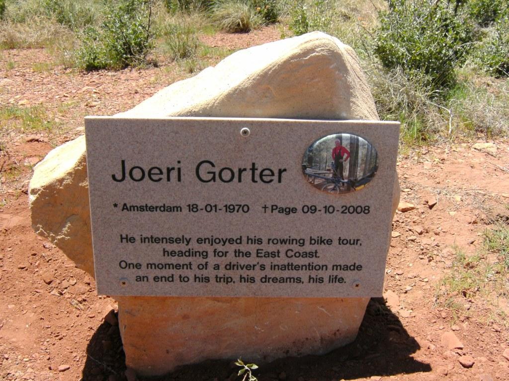 The inscription reads “One moment of a driver’s inattention made and end to his trip, his dreams, his life”. Joeri Gorter, a Dutch visitor touring the US, was killed by a careless delivery truck driver near Page, AZ, in 2008.