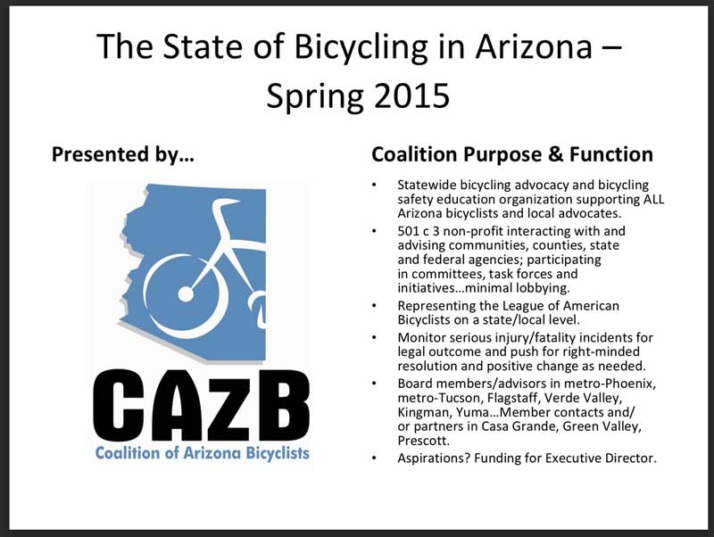This presentation is a general overview of bicycling, suitable for general audiences, and was prepared and presented by Coalition President Bob Beane to the Phoenix Rotary on Wednesday 4/8/2015.