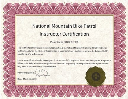 Verde Valley cylist, and CAzBike Northern Arizona Representative, Randy Victory has earned an Instructor’s Certificate from the National Mountain Bike Patrol organization. Randy is now qualified to train volunteers to perfom the duties of NMBP patrollers and/or ambassadors.